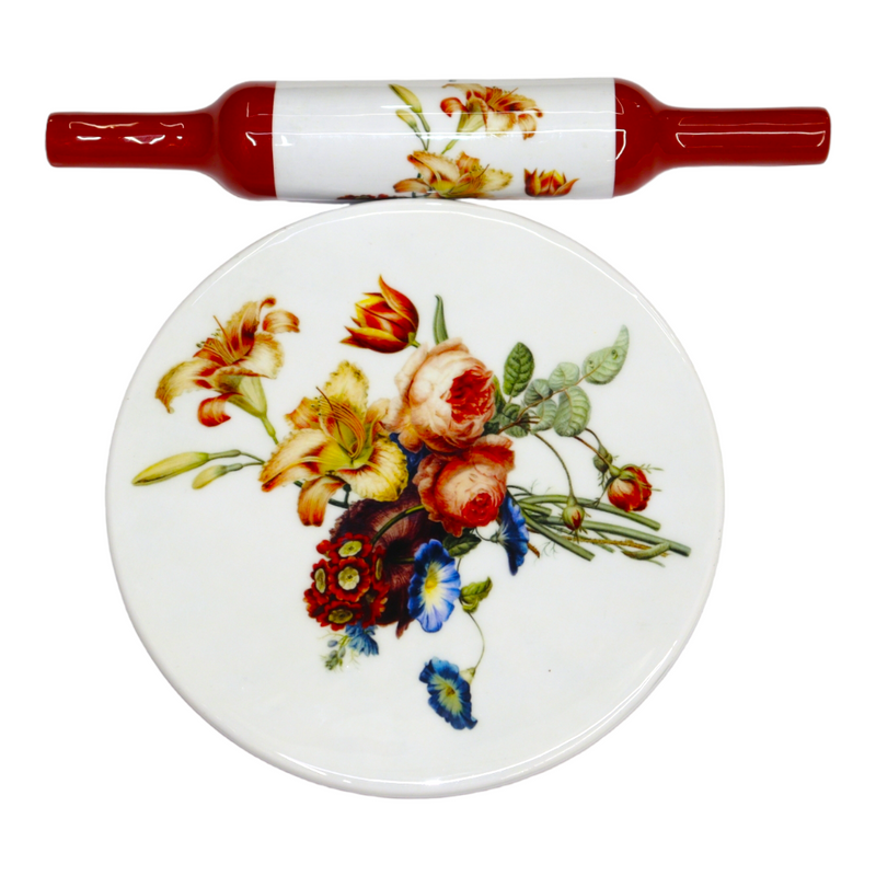 KUVI Printed White Marble Roti Maker with Wooden Belan Enamel Print/White Marble Chakla 10 Inch Diameter with Belan (Red Rose)